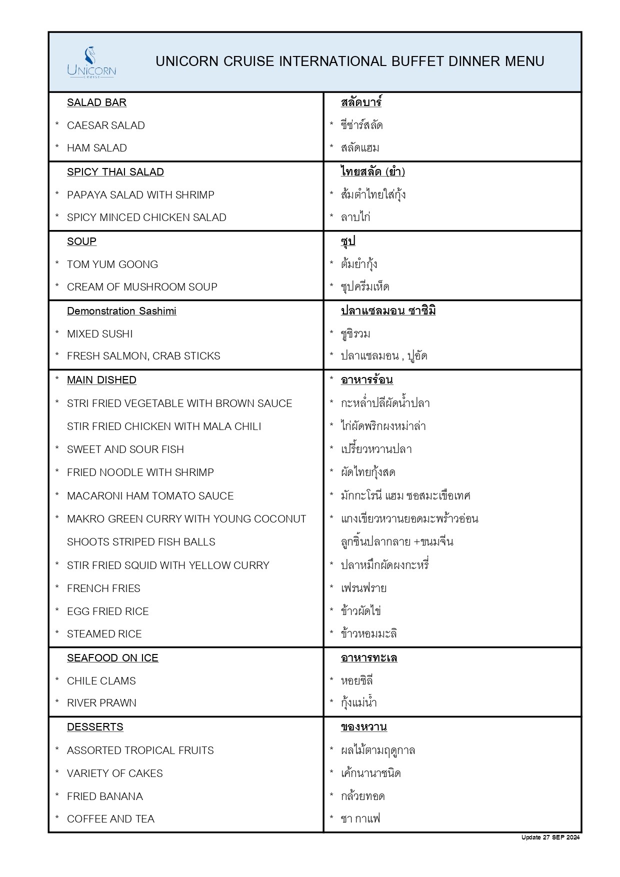 อัตราค่าบริการรวม ✔️ ค่าล่องเรือ✔️ อาหารบุฟเฟ่ต์ไทย-นานาชาติ✔️ บุฟเฟ่ต์ซีฟู๊ด (กุ้งเผา, หอยแมลงภู่นิวซีแลนด์)✔️ บุฟเฟ่ต์ซูชิ, แซลมอนซาซิมิ✔️ ฟรี! มินิเค้กวันเกิด