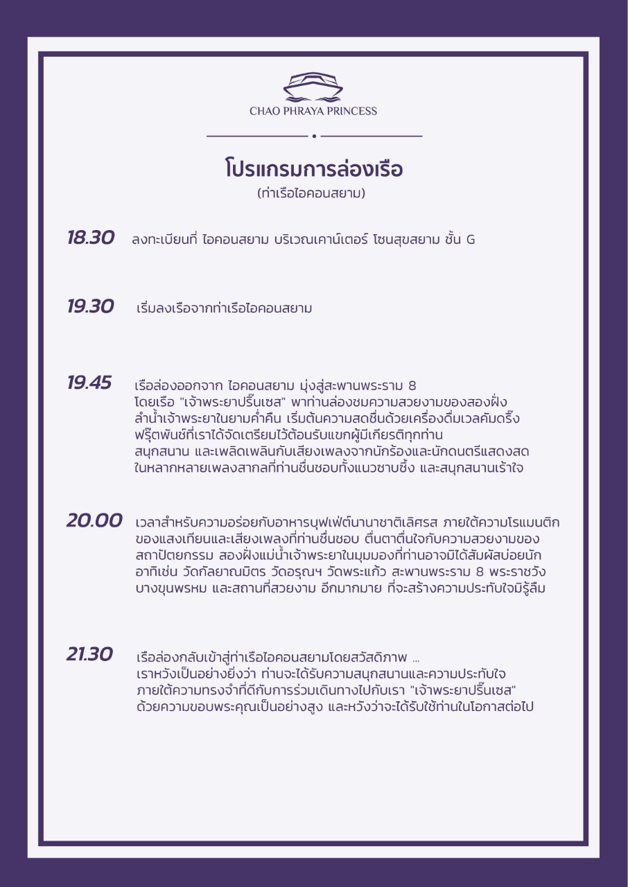 ขึ้นท่าเรือ -- ไอคอนสยาม / เอเชียทีค เดอะ ริเวอร์ฟร้อนท์รอบเวลา : 19.30 - 21.30 น. / 20.00 - 22.00 น.