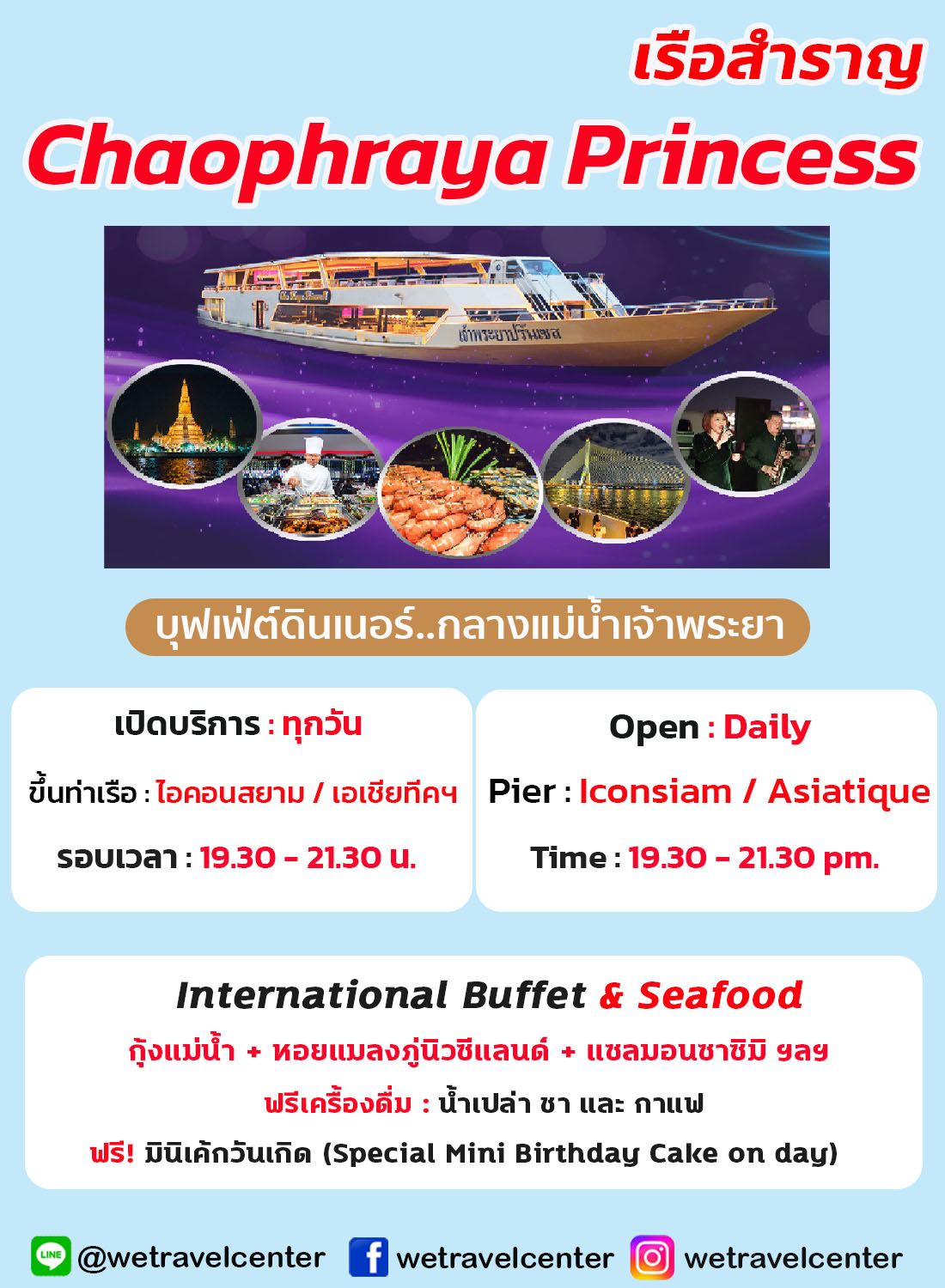 เรือสำราญ "เจ้าพระยาปริ้นเซสครูซส์" ดื่มด่ำไปกับบรรยากาศแห่งความหรูหรางดงามของ Chaophraya Princess Cruise ตระการตากับแสงสียามค่ำคืนในท้องน้ำเจ้าพระยา ละเมียดละไมกับอาหารนานาชาติที่ตั้งใจรังสรรค์ด้วยวัตถุดิบชั้นยอดหลากหลายเมนู ชมการแสดงศิลปวัฒนธรรมไทยอันน่าภาคภูมิใจและรับฟังบทเพลงไพเราะ อีกทั้งบริการคุณภาพระดับโรงแรมห้าดาวให้ค่ำคืนที่แสนโรแมนติกของคุณ เต็มเปี่ยมไปด้วยความสุขกับคนพิเศษข้างกาย