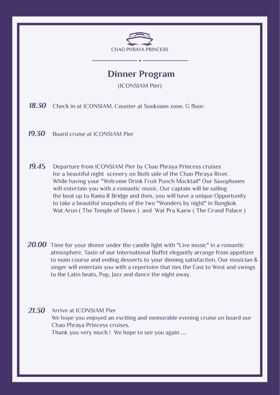✅ Dinner (Open Daily)✅Time : 19.30 - 21.30 hrs. ( 2 hrs.) ✅Pier : Icon Siam / Asiatique the riverfront