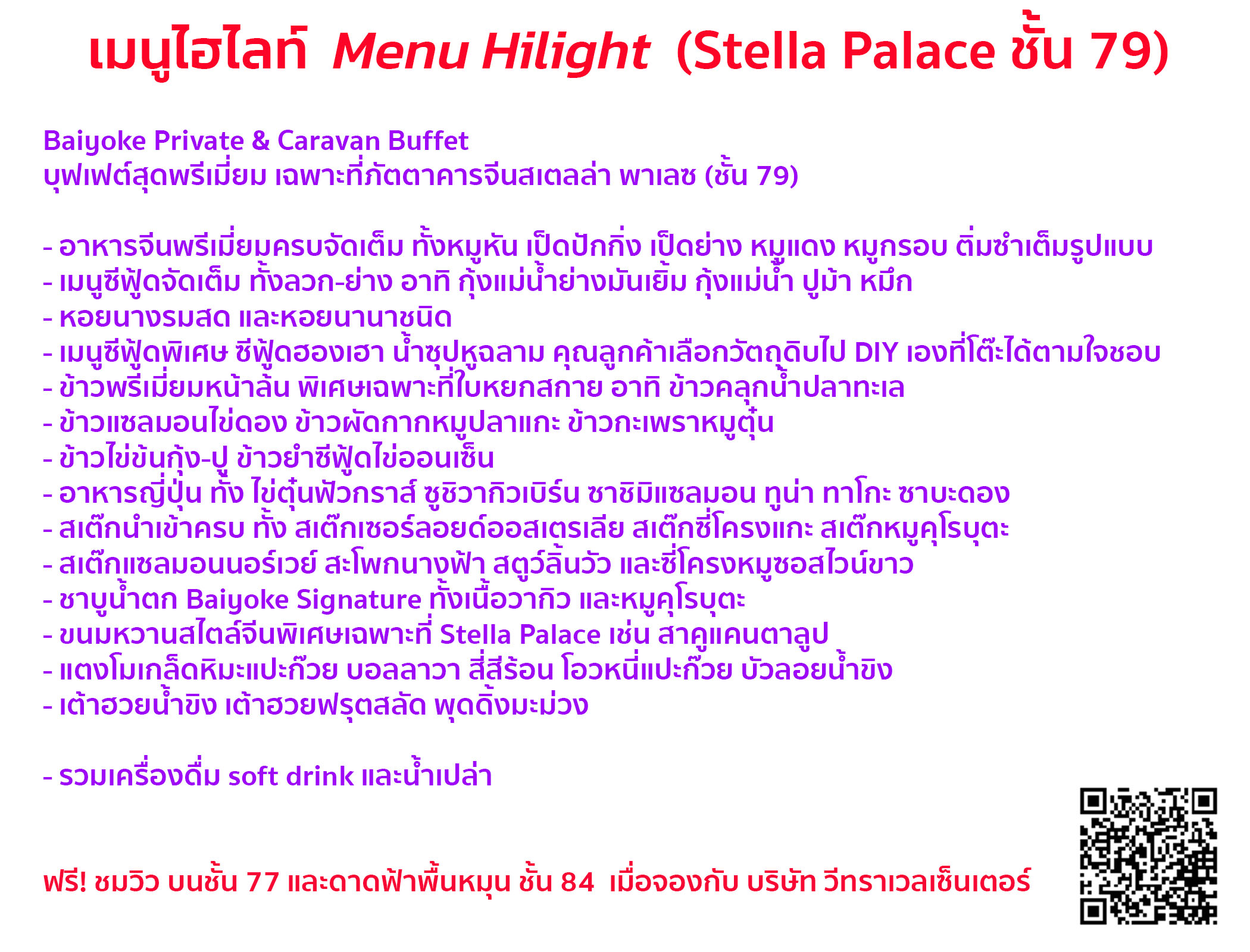 --------------------------------------------✔️ ฟรี! เข้าใช้บริการ: จุดชมวิวหมุน (ชั้น 84) & จุดชมวิว (ชั้น 77)✔️ Baiyoke Private & Caravan Buffet✔️ บุฟเฟต์สุดพรีเมี่ยม เฉพาะที่ภัตตาคารจีนสเตลล่า พาเลซ (ชั้น 79) ในรูปแบบคาราวานบุฟเฟต์ที่จะเข็นรถบริการทุกท่านถึงที่โต๊ะ สะดวกสบายระดับ V.I.P. สะอาดปลอดภัยเกินมาตรฐาน ให้เต็มอิ่มกันแบบฟินๆ อย่างสบายใจ
