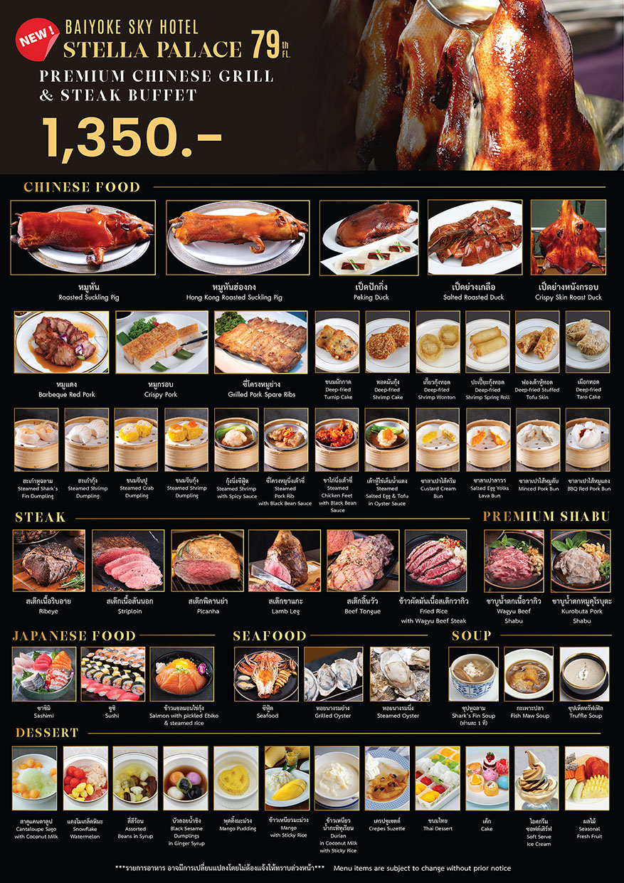 ✔️ บุฟเฟต์สุดพรีเมี่ยม เฉพาะที่ภัตตาคารจีนสเตลล่า พาเลซ (ชั้น 79) ในรูปแบบคาราวานบุฟเฟต์ที่จะเข็นรถบริการทุกท่านถึงที่โต๊ะ สะดวกสบายระดับ V.I.P. สะอาดปลอดภัยเกินมาตรฐาน ให้เต็มอิ่มกันแบบฟินๆ อย่างสบายใจ- ✔️ อาหารจีนพรีเมี่ยมครบจัดเต็ม ทั้งหมูหัน เป็ดปักกิ่ง เป็ดย่าง หมูแดง หมูกรอบ ติ่มซำเต็มรูปแบบ